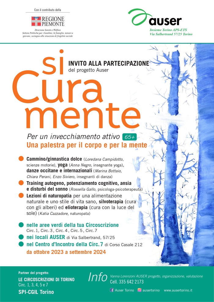 Sono partite, per i cittadini over 65, nelle Circoscrizioni 1, 3, 4, 5 e 7 le attività AUSER di EDUCAZIONE AL MOVIMENTO (Yoga, Gruppi cammino/Ginnastica dolce, Danze occitane e internazionali), TRAINING AUTOGENO, POTENZIAMENTO COGNITIVO (per rilassarsi, avere un buon sonno e mantenere vive le capacità mentali della persona e per prevenzione dei disturbi neurocognitivi) e NATUROPATIA (lezioni di alimentazione naturale per uno stile di vita sano e corretto che coadiuva l'ossigenazione del cervello e potenzia le connessioni celebrali) condotte da una consolidata équipe di professionisti che collaborano da tempo con l'Associazione.