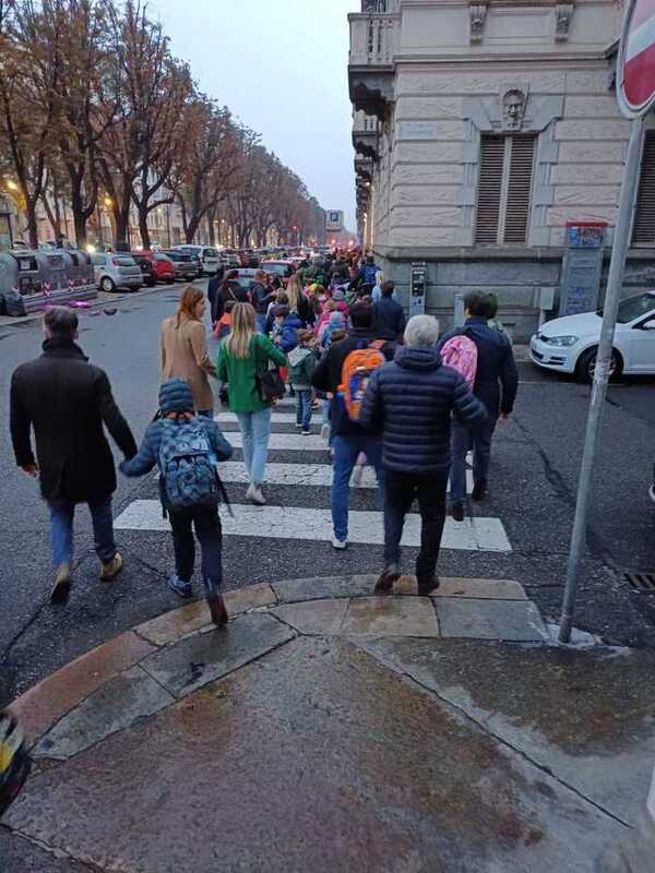 Dopo la prima edizione del "Bike to school" con la scuola media Foscolo - a marzo 23 - e la prima "Walk to school" con le scuole Coppino e Foscolo - a settembre 23 - nella mattina di venerdì 27 ottobre oltra 130 bambini, insieme ai loro genitori, si sono recati a scuola a piedi arrivando da tre punti diversi (corso Vittorio, corso Sommeiller, Giardino del Fante) per concludere con un momento di saluto e festa nel cortile di via Massena.