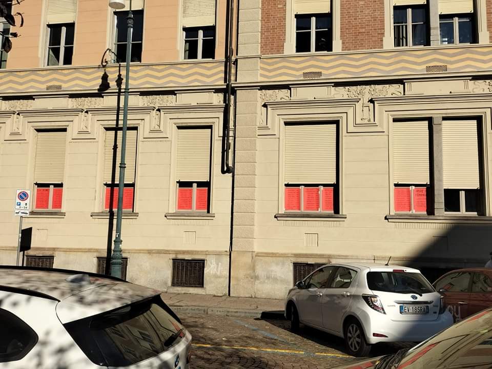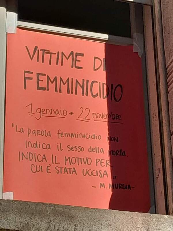 In occasione della giornata internazionale contro la violenza sulle donne l'Associazione Acca, presso il Pink Coworking di via Bertolotti, 10, ha attaccato agli 11 vetri del piano terra dei cartelli rossi con la lista dei nomi delle vittime dall'inizio del 2023.