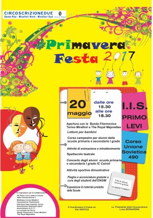 Sabato 20 maggio dalle ore 15.30 alle ore 18.30 tutte le scuole di Mirafiori Sud all'ITIS Primo Levi in c.so Unione Sovietica, 490Animazione, Giochi, Corsa campestre,Acconciature gratuite, Concerto e Spettacoli di fine anno.