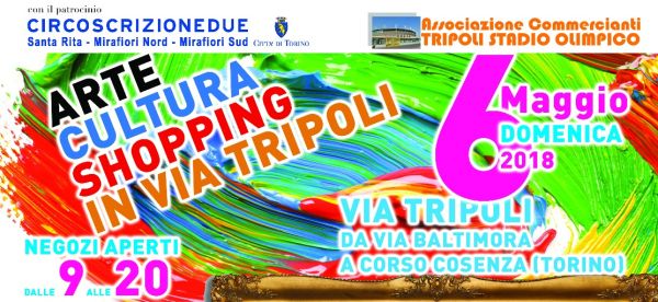 Domenica 6 maggio 2018 negozi aperti tutto il giorno a partire dalle ore 9.00 sino alle ore 20.00 con esposizione e vendita lungo la via Tripoli da Via Baltimora a Corso Cosenza. A cura dell' Associazione Commercianti Tripoli Stadio Ollimpico e con il patrocinio della Circoscrizione 2. Esposizione di quadri, giro sui pony, animazioni musicali, giostre e scivoli gonfiabili, banchetti di produttori artigiani.