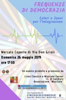 Domenica 26 maggio 2019alle ore 17.30 presso il Mercato Coperto di via Don Grioli si svolgerà l'evento finale del progetto "Frequenze di Democrazia - Colori e Suoni per l'Integrazione", prodotto e promosso da Liceo Classico e Musicale Cavour, 1.C. di Candiolo, Associazione "MusiCare".