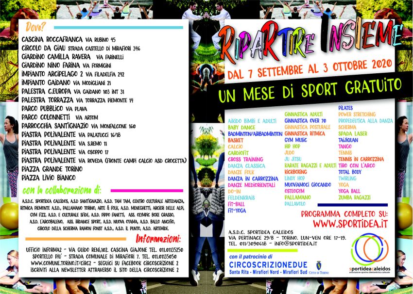 L'associazione Sportidea Caleidos ha organizzato, con il patrocinio della Circoscrizione 2, "Ripartiamo Insieme 2020": una serie di eventi sportivi gratuiti che si terranno dal 7 Settembre al 3 Ottobre 2020 nel territorio della Circoscrizione 2. Gli sport protagonisti saranno variegati ed indirizzati ai cittadini di tutte le età.