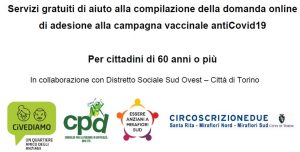 La Circoscrizione 2, Ci Vediamo (Un quartiere amico degli anziani), la Consulta per le Persone in Difficoltà ed Essere Anziani a Mirafiori Sud, in collaborazione con Distretto Sociale Sud Ovest - Città di Torino, offrono, ai cittadini di 60 anni o più, servizi gratuiti per la compilazione della domanda di adesione alla campagna vaccinale Anti Covid 19:
