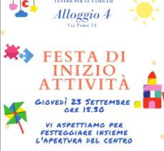 Giovedì 23 settembre alle ore 15.30 presso il Centro per le Famiglie "Alloggio 4" in via Poma 14 vi aspettiamo per festeggiare insieme l'apertura del servizio.
