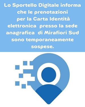 Lo Sportello Digitale informa che le prenotazioni per il rilascio della Carta d'Identità elettronica (CIE) presso la Sede Anagrafica di Mirafiori Sud - Strada comunale Castello di Mirafiori, 8 - sono momentaneamente sospese.