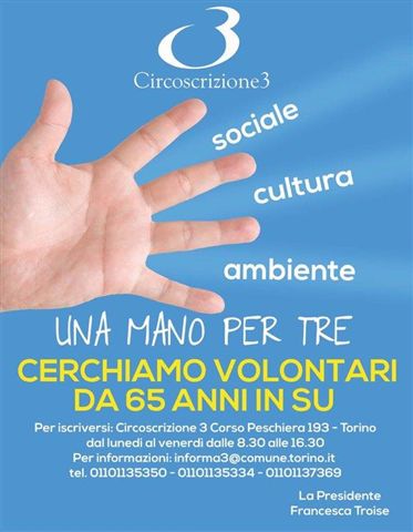 Coloro che vorranno aderire al progetto "Una mano per tre", possono ritirare la domanda di iscrizione in distribuzione presso la sede della Circoscrizione 3 - Corso Peschiera 193 - 1° piano, dal lunedì al venerdì in orario 8.30 - 16.00