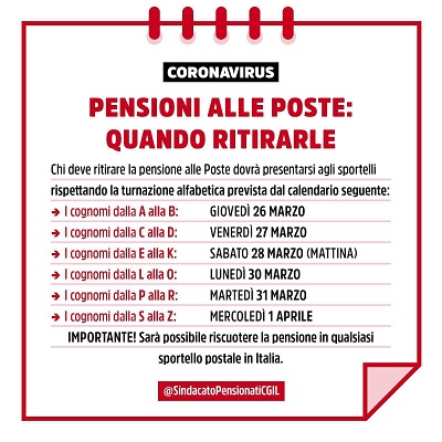 Gli sportelli di Poste Italiane erogano le pensioni con orari e modalitą distinte per giorni.Vedi all'interno