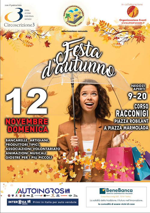 Con il patrocinio della Circoscrizione 3, domenica 12 novembre in corso Racconigi, da piazza Robilant a piazza Marmolada, Festa d'autunno. Negozi aperti dalle 09:00 alle 20:00