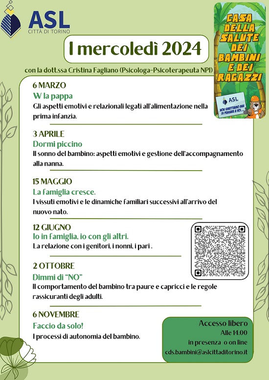 La casa della Salute dei Bambini e dei Ragazzi presenta inoltre una serie di incontri in presenza o online con la dottoressa Fagliano, psicologa e psicoterapeuta NPI, sempre di mercoledì, alle ore 14.00.