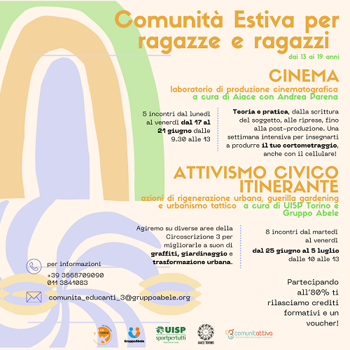Aiace Torino , Gruppo Abele Onlus e Uisp Torino ti invitano a un'estate indimenticabile per ragazzi e ragazze dai 13 ai 19 anni! Scopri i laboratori di produzione cinematografica e le azioni di attivismo civico itinerante.