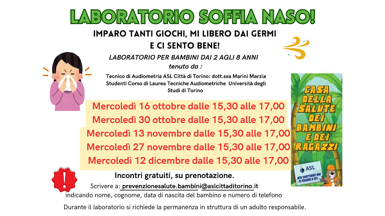 Data l'affluenza agli incontri precedenti, vi proponiamo nuovi incontri dei Laboratori "Soffia Naso"!👉 Eventi gratuiti con prenotazione obbligatoria tramite mail prevenzionesalute.bambini@aslcittaditorino.it