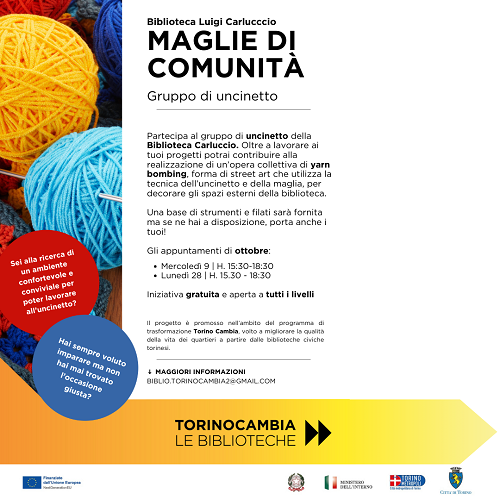 Nell'ambito del programma Torino Cambia della Città di Torino, la biblioteca diventa il luogo dove poter sia lavorare ai tuoi progetti in compagnia sia contribuire alla realizzazione di un'opera collettiva di yarn bombing, forma di street art che utilizza la tecnica dell'uncinetto e della maglia, per decorare gli spazi esterni della biblioteca.