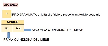 La presente agenda rappresenta una semplice indicazione di massima sulla programmazione degli interventi di manutenzione ordinaria del verde orizzontale nelle zone indicate. Tali interventi sono suscettibili di modifiche a causa di mutate condizioni meteorologiche o di sopravvenute urgenze manutentive in luoghi diversi.