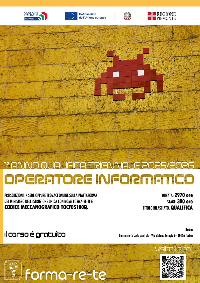 Per informazioni scrivi a segreteria@forma-re-te.it o contatta il numero 011 08675651° anno qualifica triennale 2025-2026 operatore informatico