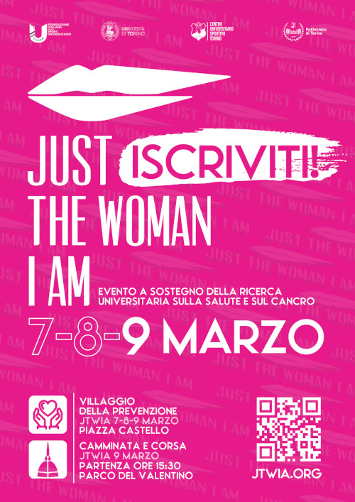 Il prossimo 9 marzo 2025 il CUS Torino sarà impegnato nell'organizzazione di JUST THE WOMAN I AM (www.jtwia.org) l'evento che dal 2014, attraverso una corsa-camminata di 5 km aperta a tutti, raccoglie i fondi per la ricerca universitaria sulla salute e sul cancro.