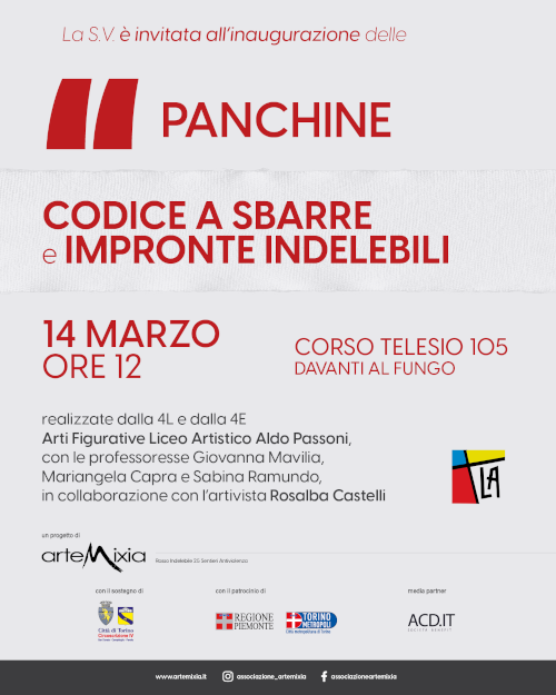 Le opere "Codice a Sbarre" e "Impronte Indelebili", realizzate dalle classi 4L e 4E Arti Figurative del Liceo Artistico Aldo Passoni, in collaborazione con l'artivista Rosalba Castelli e con le prof-tagoniste Giovanna Mavilia, Mariangela Capra e Sabina Ramundo.Le panchine sono il risultato del percorso formativo Rosso Indelebile,