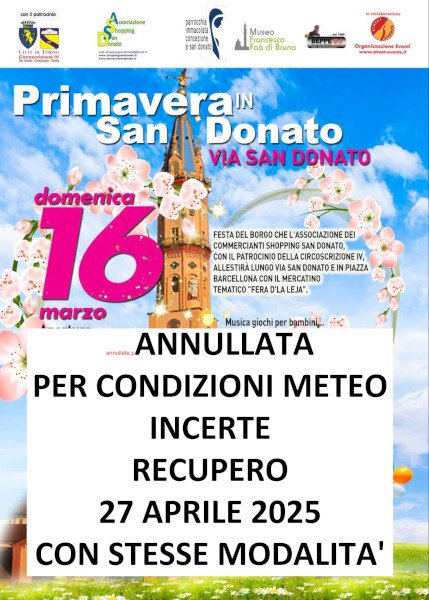 ⚠️ ⚠️ Si informa che la manifestazione "Primavera in San Donato", prevista nella giornata di domenica 16 marzo 2025, č stata annullata a causa delle previsioni meteo avverse.L'evento viene rinviato a Domenica 27 aprile 2025