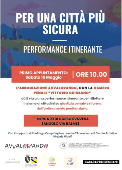 ⚖️ L'Associazione Avvalorando, in collaborazione con la Camera Penale "Vittorio Chiusano" del Piemonte Occidentale e Valle d'Aosta e il Circolo Artistico Virginia Woolf, durante il mese di maggio darà vita ad una performance itinerante che toccherà, intanto, tre punti della città, per dare avvio ad una campagna di sensibilizzazione rivolta ai cittadini torinesi sui temi della riforma della giustizia penale e dell'ordinamento penitenziario nel nostro paese.
