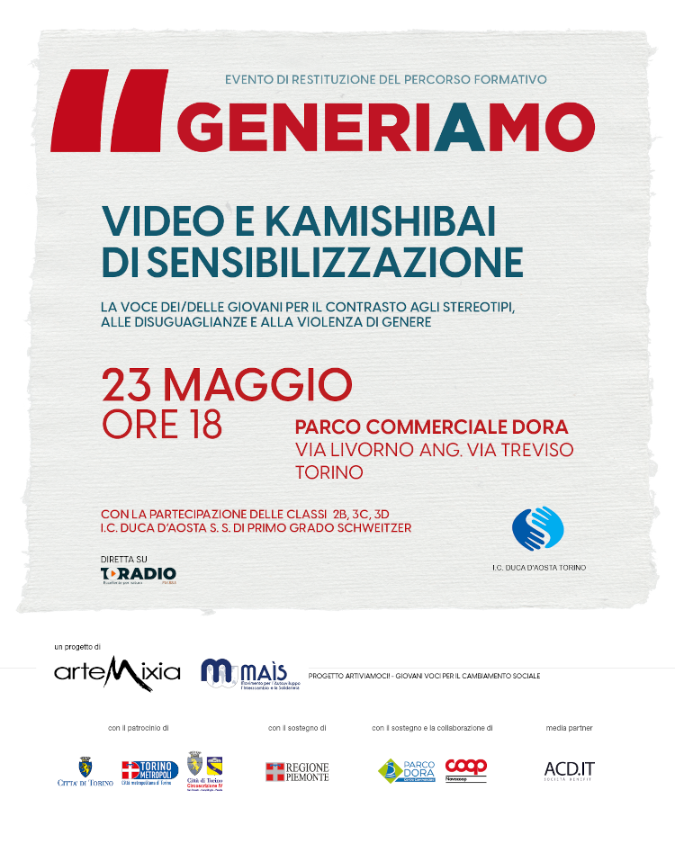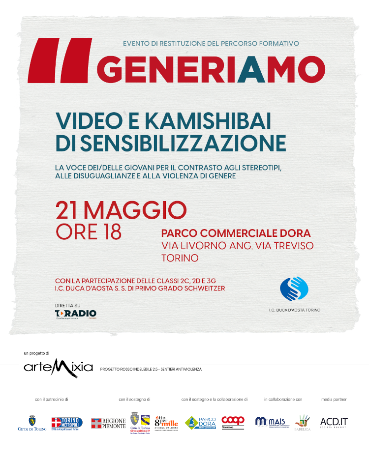 👉Il progetto è promosso da Artemixia (21 maggio) e da Artemixia e Mais Ong (23 maggio), con il sostegno della Regione Piemonte, della Circoscrizione 4 e dell'8x1000 della Chiesa Valdese, in collaborazione con Nova Coop s.c., Parco Commerciale Dora, Babelica APS, e con il patrocinio della Città di Torino e della Città Metropolitana di Torino.