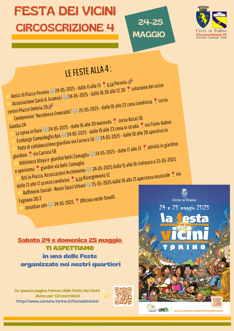Un'iniziativa con cui la Cittā di Torino e l'Agenzia Territoriale per la Casa del Piemonte Centrale aderiscono alla Giornata europea dei Vicini, nata a Parigi nel 1999 con l'obiettivo di promuovere il senso di comunitā e le buone relazioni di quartiere.