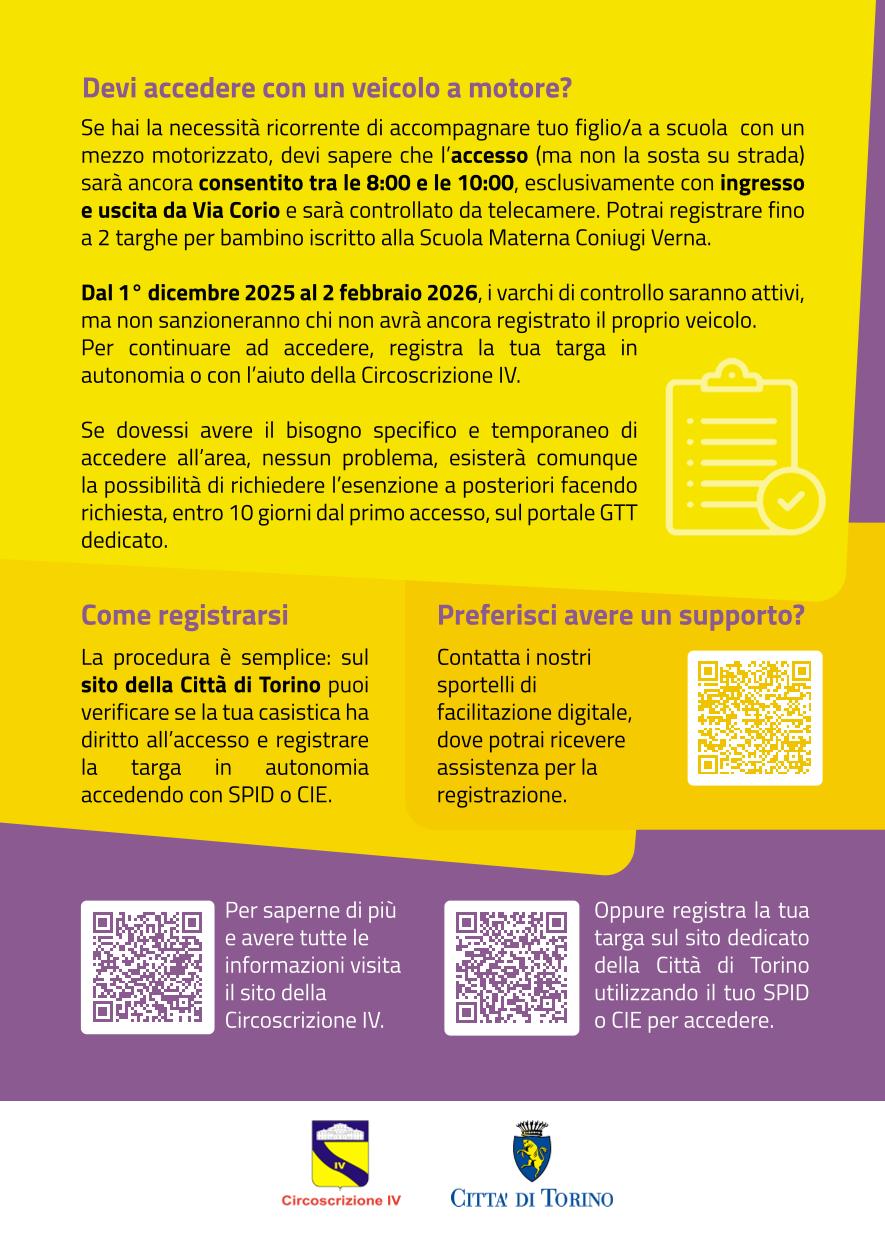 Accompagnamento minori alla scuola materna "Coniugi Verna". L'accesso, il transito e la fermata per il tempo strettamente necessario, sarà consentito ai veicoli utilizzati per l'accompagnamento dei minore presso la scuola materna "Coniugi Verna". L'orario di apertura del varco sarà dalle ore 08 alle ore 10, con ingresso e uscita solamente da via Corio. Ogni famiglia potrà registrare un massimo di 2 targhe per ogni minore iscritto alla scuola.Per registrarsi (accedendo con SPID o CIE) è necessario utilizzare il seguente link: https://www.comune.torino.it/servizi/accesso-aree-pedonali-fuori-ztl