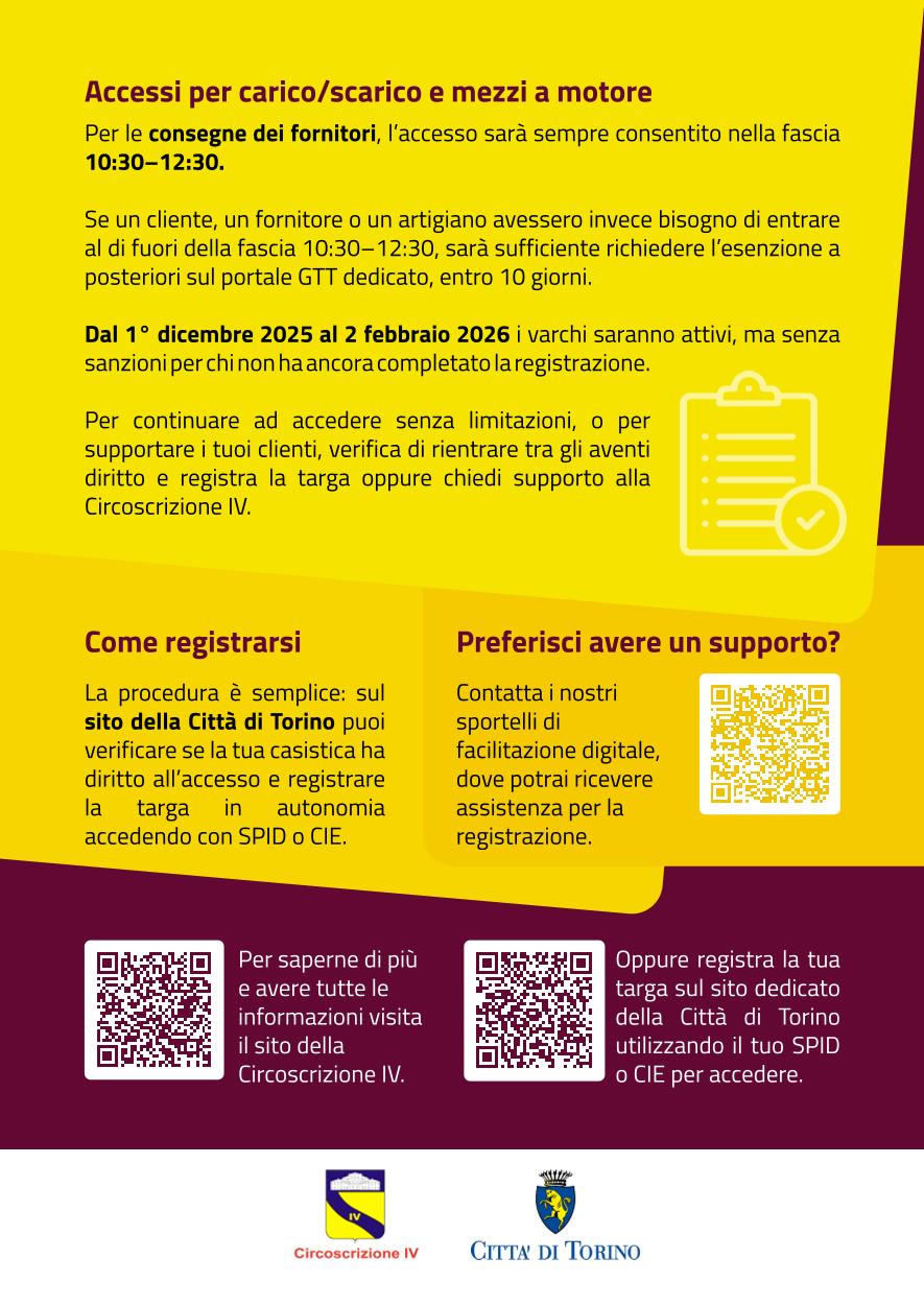 Per le consegne dei fornitori, l'accesso sarà sempre consentito nella fascia 10 e 30 - 12 e 30. Se un cliente, un fornitore o un artigiano avessero invece bisogno di entrare al di fuori della fascia 10 e 30 - 12 e 30, sarà sufficiente richiedere l'esenzione a posteriori sul portale GTT dedicato, entro 10 giorni: https://www.gtt.to.it/cms/aree-pedonali/250-aree-pedonali/12270-autorizzazioni-occasionali-esenti-a-posteriori