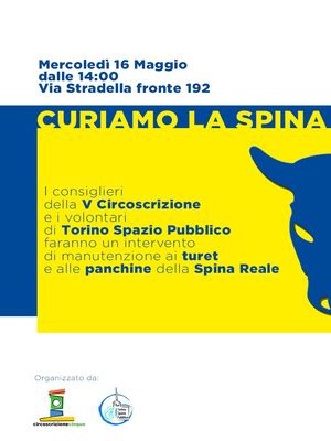 Mercoledì 16 maggio 2018 dalle ore 14,00 in Via Stradella fronte 192, intervento di manutenzione ai turet e alle panchine della Spina Reale a cura dei consiglieri circoscrizionali e dei volontari di Torino Spazio Pubblico.