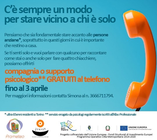 La Cooperativa Sociale Zenith ha attivato in questi giorni un servizio di supporto telefonico, di compagnia o psicologico, per gli over 65enni di Torino che si sentono soli. Il servizio èGRATUITO