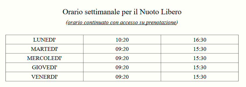 L'orario di accesso al nuoto libero è il seguente: lunedì dalle ore 10:20 alle ore 16:30, dal martedì al venerdì dalle ore 9:20 alle ore 15:30, continuativo anche nella pausa pranzo per facilitare l'ingresso anche agli utenti lavoratori.