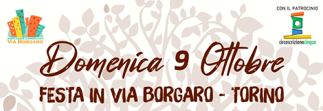 Domenica 9 ottobre 2022 avrà luogo la festa di via "L'Autunno in Via Borgaro si tinge...Arte, Cibo e Cultura" organizzata dall'Associazione Artigiani e Commercianti di via Borgaro; sarà interessata l'area di via Borgaro nel tratto compreso tra via Lucento e Largo Borgaro (escluse) dalle ore 09:00 alle ore 20:00 circa.