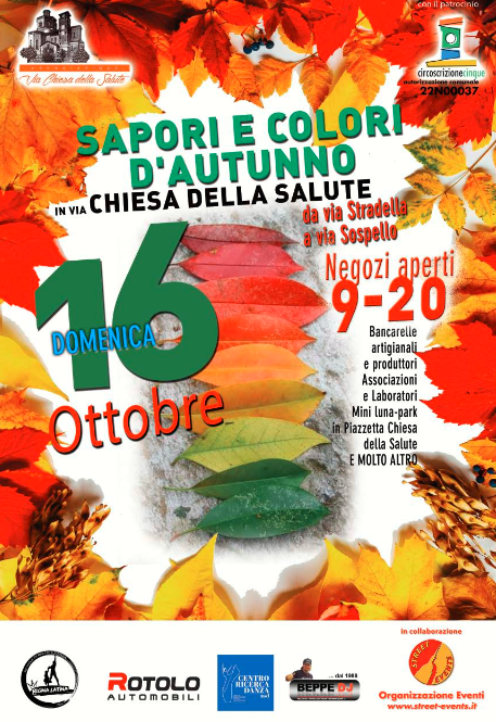 Domenica 16 ottobre 2022 avrà luogo la festa di via "Sapori e colori d'autunno" organizzata dall'Associazione Artigiani e Commercianti di via Chiesa della Salute; sarà interessata l'area di via Chiesa della Salute, nel tratto compreso tra C.so Grosseto e via Stradella (escluse) e via Vibò da via Chiesa della Salute a P.zza Chiesa della Salute, dalle ore 09:00 alle ore 20:00 circa.