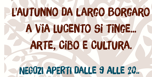 Domenica 30 ottobre 2022 avrà luogo la festa di via "L'Autunno in Via Borgaro si tinge...Arte, Cibo e Cultura" organizzata dall'Associazione Artigiani e Commercianti di via Borgaro; sarà interessata l'area di via Borgaro nel tratto compreso tra via Lucento e Largo Borgaro (escluse) dalle ore 09:00 alle ore 20:00 circa.