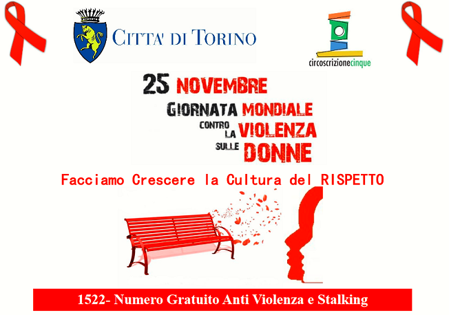 - alle ore 11.00: presso la Sala ex- Urp della Circoscrizone, si terrà la Cerimonia per la posa della targa, in ricordo della Giornata Mondiale per l'eliminazione della violenza contro le Donne e l'installazione di una panchina di colore rosso lungo la Spina Reale;