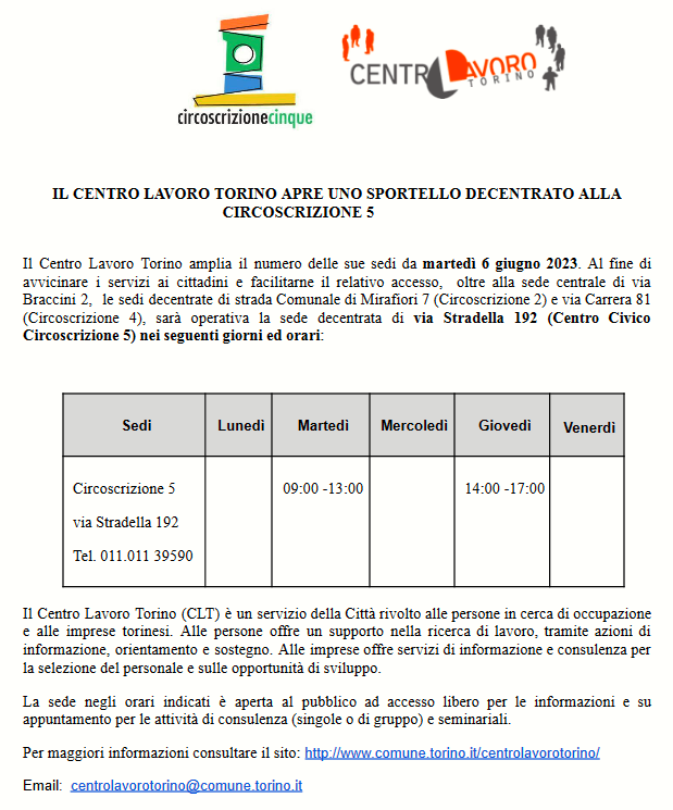 Il Centro Lavoro Torino amplia il numero delle sue sedi, da martedì 6 giugno 2023, al fine di avvicinare i servizi ai cittadini e facilitarne il relativo accesso, oltre alla sede centrale di via Braccini 2, le sedi decentrate di strada Comunale di Mirafiori 7 (Circoscrizione 2) e via Carrera 81 (Circoscrizione 4), sarà operativa la sede decentrata di Via Stradella 192 (Centro Civico Circoscrizione 5) nei seguenti giorni ed orari: martedì dalle ore 09.00 alle ore 13.00 - giovedì dalle ore 14.00 alle ore 17.00 - telefono: 011 01139590.