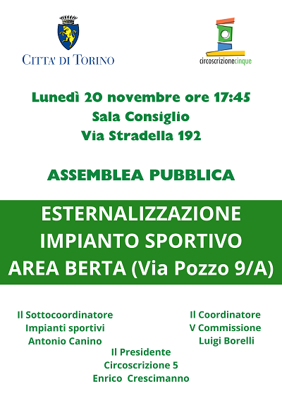 Si informa la cittadinanza che il giorno 20 novembre alle ore 17:45 presso la Sala Consiglio della Circoscrizione 5 di Via Stradella 192, si terrą l'assemblea pubblica per l'esternalizzazione dell'impianto sportivo denominato Area Berta sito in Via Pozzo 9/A.
