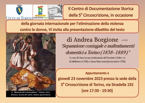23 novembre 2023 alle ore 17.30: presso sede della Circoscrizione Via Stradella, 192 alle ore 17.30 il CDS propone il dibattito del saggio di Andrea Borgione (1988-20323) dal titolo: "Separazione coniugale e maltrattamenti domestici a Torino"; nell'occasione sarà esposta la mostra "L'inizio dell'industrializzazione e il Canale Ceronda (1834-1879)" che offre un contesto e sfondo storico al contenuto del saggio di Andrea Borgione, oggetto della presentazione e dibattito.