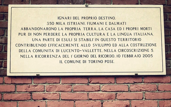"Ignari del proprio destino, 350mila Istriani, Fiumani e Dalmati abbandonarono la propria terra, la casa ed i propri morti pur di non perdere la propria cultura e la lingua italiana. Una parte di esuli si stabilì in questo territorio contribuendo efficacemente allo sviluppo ed alla costruzione della comunità di Lucento-Vallette, nella Circoscrizione 5. Nella ricorrenza del 1° Giorno del Ricordo, 10 febbraio 2005 il Comune di Torino pose".