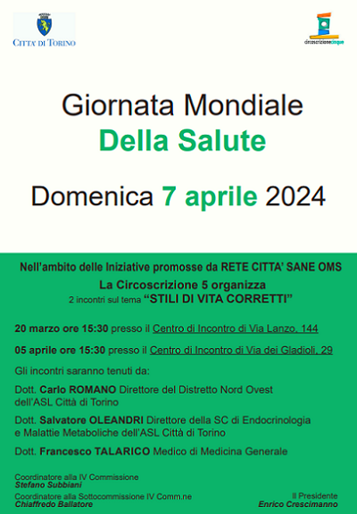 Il 7 aprile è la Giornata mondiale della salute, nell'ambito delle iniziative promosse da Rete Città Sane OMS la Circoscrizione 5 organizza 2 incontri sul tema "Stili di vita corretti" mercoledì 20 marzo 2024 e venerdì 05aprile 2024.