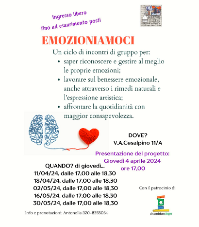 L'Asssociazione Coordinamento TO5 propone un ciclo di incontri di gruppo per imparare a riconoscere e gestire al meglio le proprie "Emozioni", lavorare sul benessere emozionale, anche attraverso i rimedi naturali e l'espressione artistica, affronatare la quotidianità con maggiore consapevolezza.