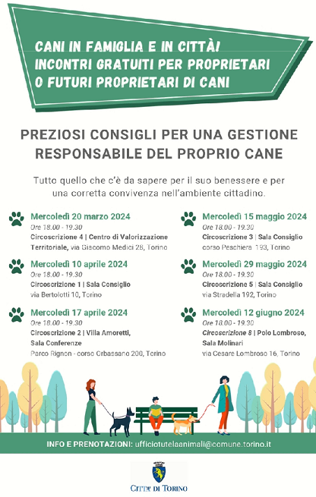 L'iniziativa di un ciclo di incontri, intitolato "Cani in famiglia e in città", promossa dalla Città di Torino e' finalizzata a fornire consigli ai possessori di cani per una gestione responsabile del proprio animale, istruendo su tutto ciò che occorre conoscere per il suo benessere e per una corretta convivenza nell'ambiente cittadino.