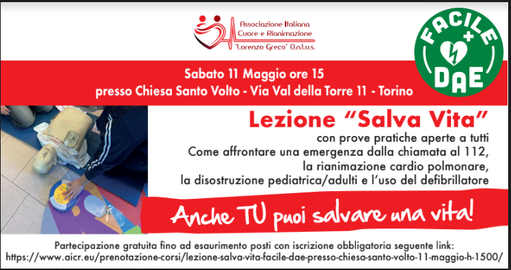 La partecipazione è gratuita fino ad esaurimento posti con iscrizione obbligatoria da effettuarsi al seguente link: https://www.aicr.eu/prenotazione-corsi/lezione-salva-vita-facile-dae-presso-chiesa-santo-volto-11-maggio-h-1500/