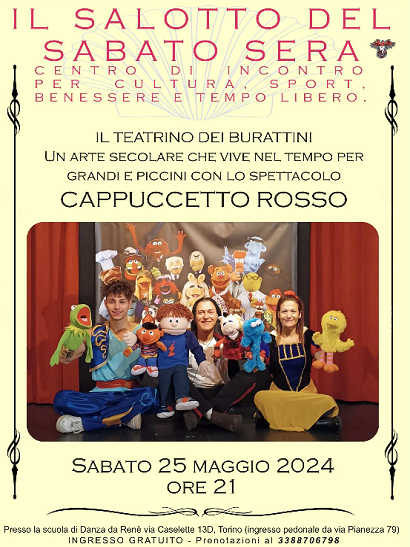Il Salotto del Sabato Sera organizza una serata special dedicata al Teatrino dei burattini, un Arte secolare che vive nel tempo per grandi e piccini con lo spettacolo - Cappuccetto Rosso- sabato 25 maggio 2024 alle ore 21.00 presso la Scuola di Danza da Renč di Torino (TO), via Casellette n.13/D.