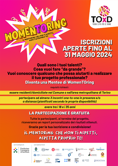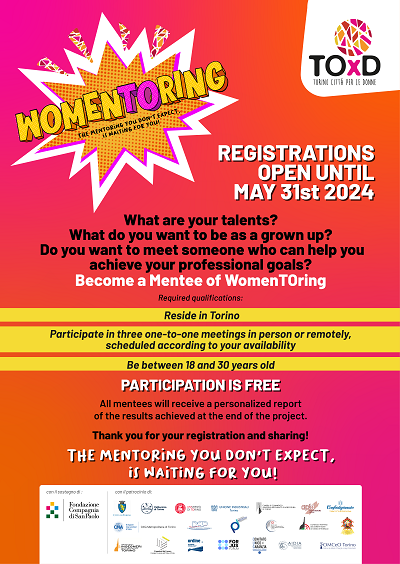 Al link: https://www.torinocittaperledonne.org/womentoring č possibile scaricare il BANDO completo e compilare il FORM DI ISCRIZIONE ON LINE.
