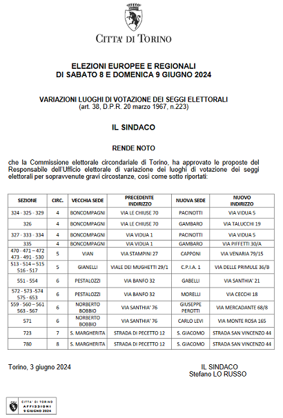 Per inagibilità di alcuni plessi scolastici si è resa necessaria la variazione di alcuni luoghi di votazione (art. 38, D.P.R. 20 marzo 1967, n.223)