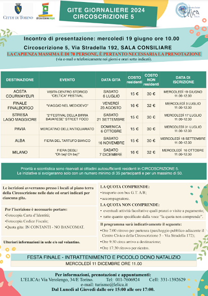 La Circoscrizione 5, per mezzo della Cooperativa Sociale L'elica O.N.L.U.S., propone gite giornaliere rivolte ai cittadini e cittadine residenti nella Circoscrizione 5.