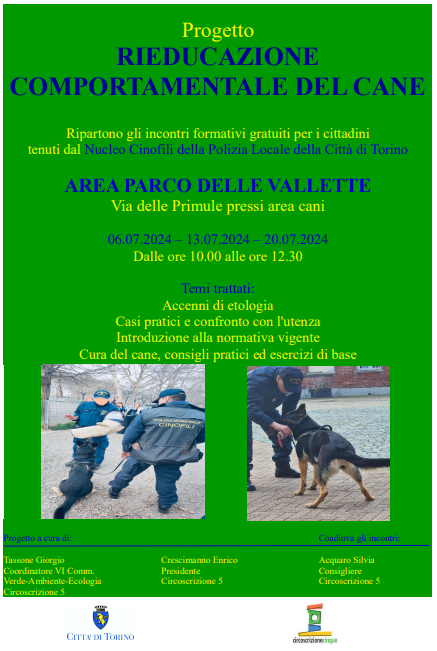 La Circoscrizione 5 comunica alla cittadinanza che sono ripartiti gli incontri formativi gratuiti per i cittadini tenuti dal Nucleo Cinofili della Polizia Locale della Città di Torino.