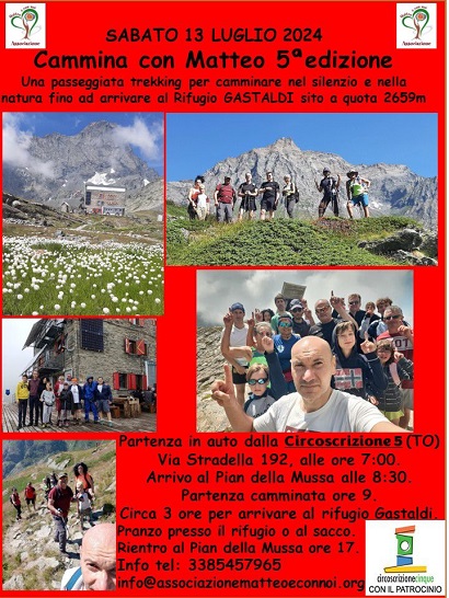 Cammina con Matteo č giunta alla sua 5° edizione. La passeggiata di trekking per raggiungere nel silenzio e nella natura il Rifugio Gastaldi a quota 2659m. Sabato 13 luglio 2024 con partenza alle ore 07:00 dalla Circoscrizione 5 via Stradella, 192.