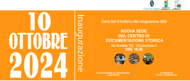 Si comunica che giovedì 10 ottobre 2024 ale ore 16.00 è prevista l'inaugurazione della nuova sede del Centro di Documentazione Storica in via Stradella, 192 Circoscrizione 5.