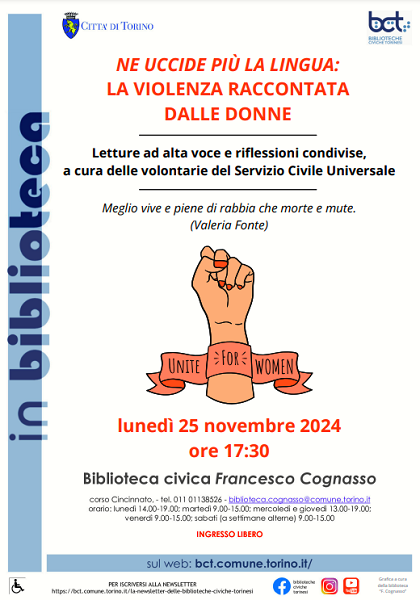 Letture ad alta voce e riflessioni condivise, a cura delle volontarie del Servizio Civile Universale, avrà luogo lunedì 25 novembre 2024 ore 17:30 presso la biblioteca civica Francesco Cognasso di c.so Cincinnato 115.